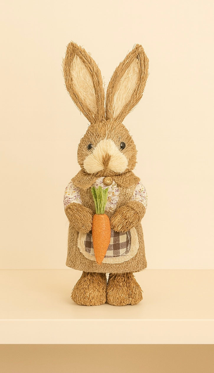 Each bunny is lovingly detailed with natural textures, soft earthy tones, and handcrafted charm. From the straw-like fur to the adorable outfits floral prints, checkered fabrics, overalls, aprons, scarves, and sweet little accessories like carrots or fish net, every element is designed to feel like it’s stepped straight out of a cosy country cottage.
