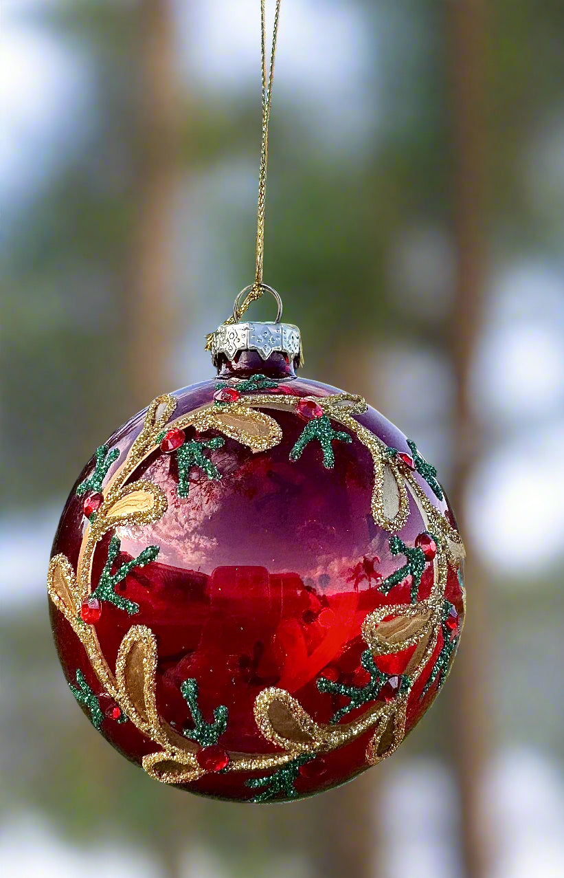 This delicate glass ornament shimmers with hand-painted holly leaves, glittering berries, and golden accents that catch the light beautifully. Suspended by a fine gold string, it’s perfect for adding a classic pop of colour and sparkle to your Christmas tree.